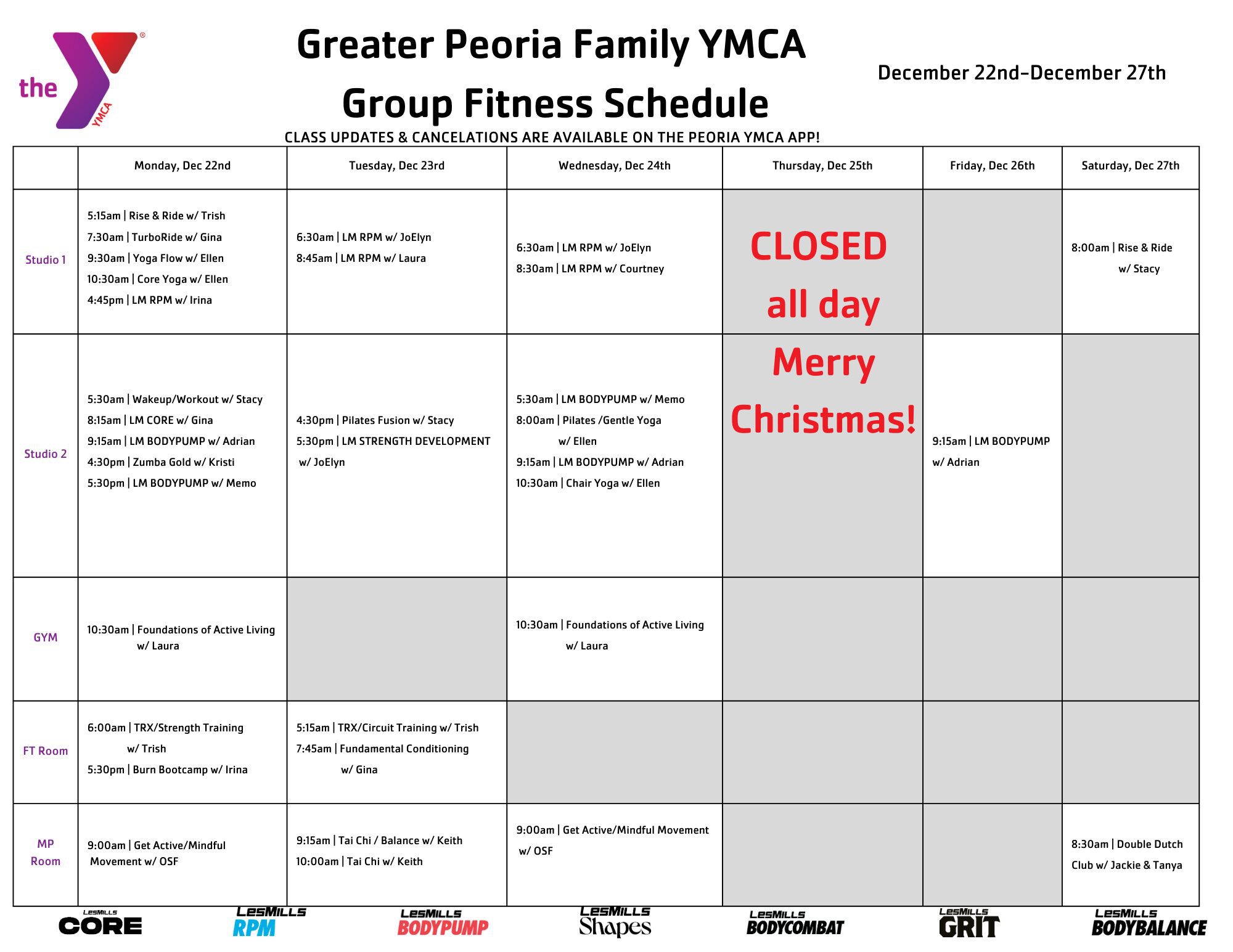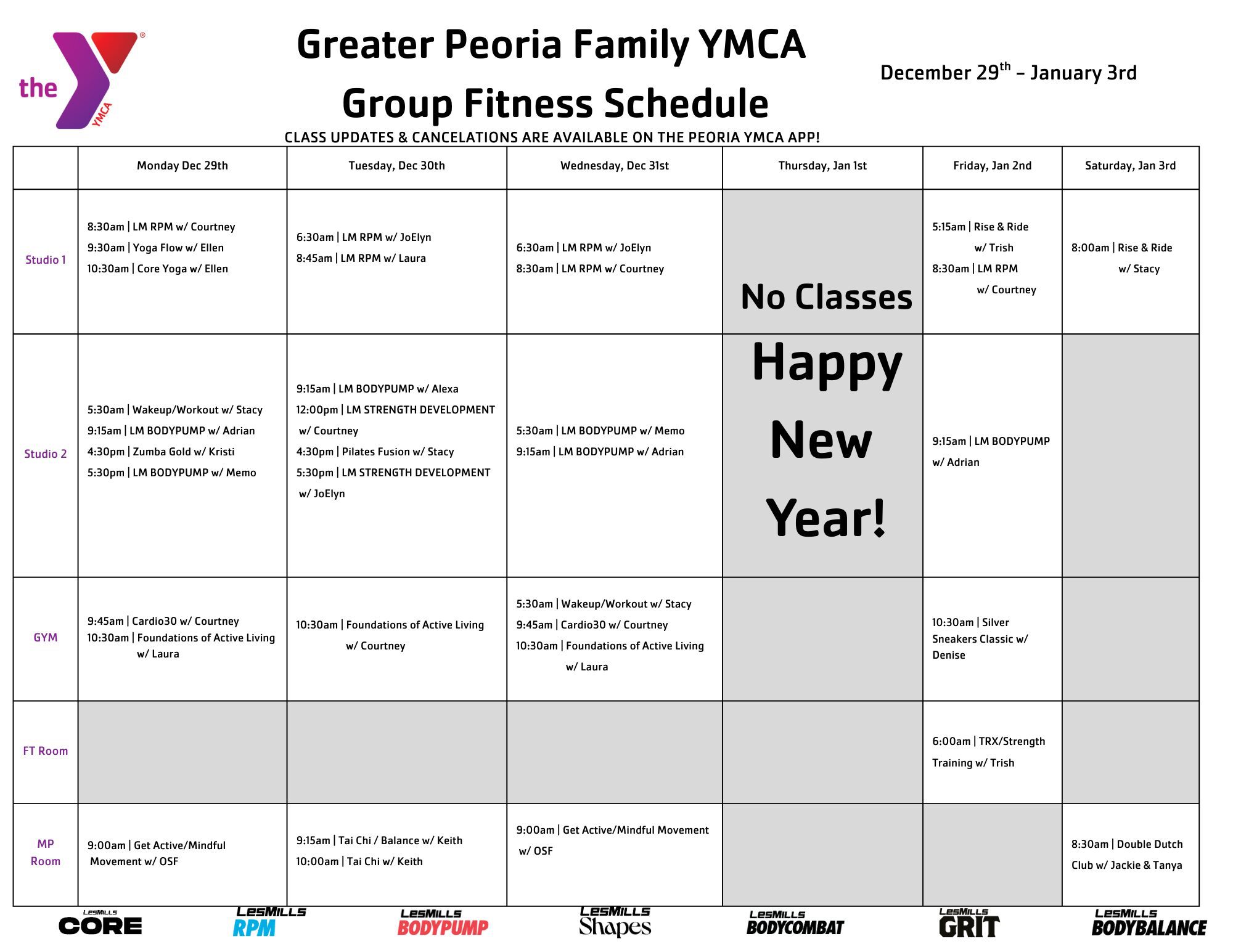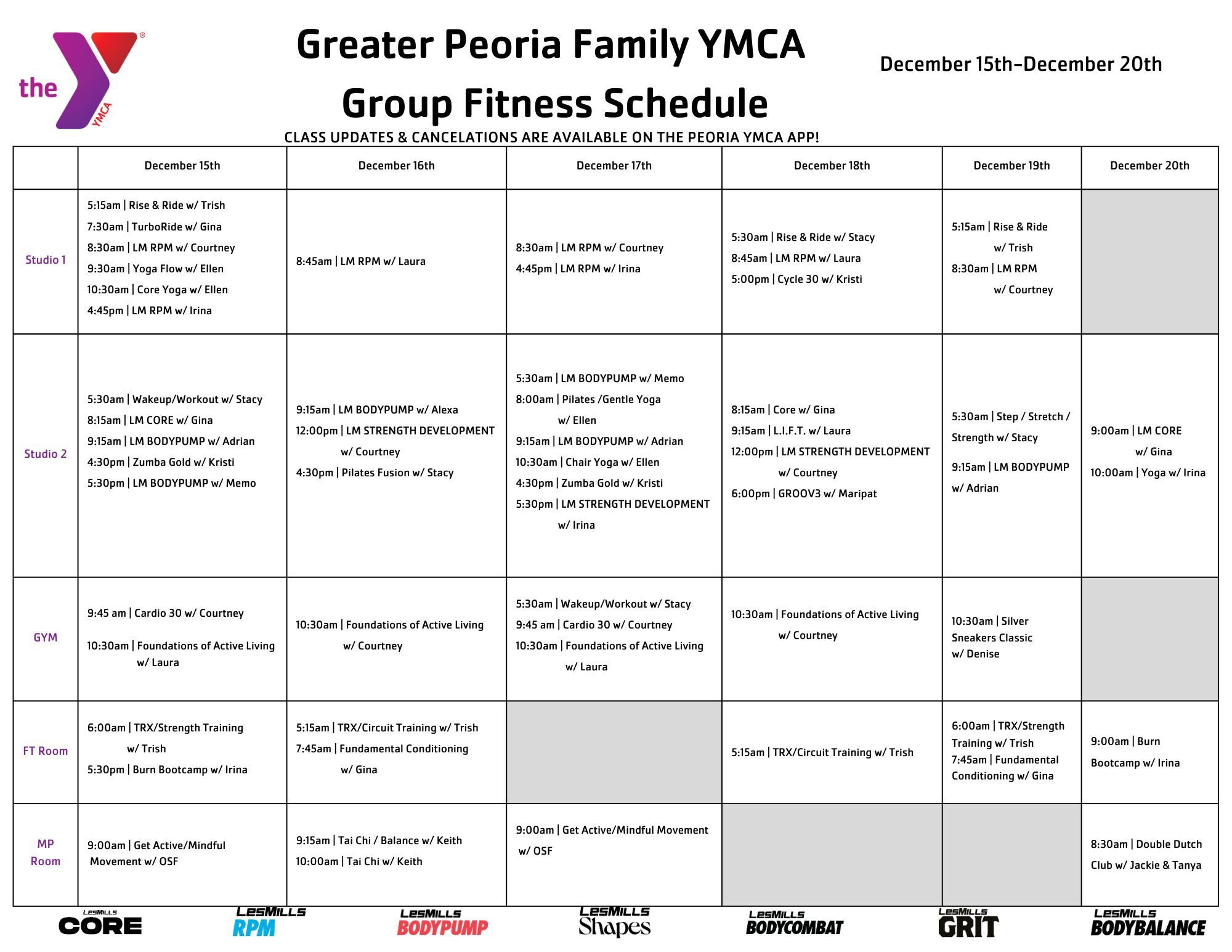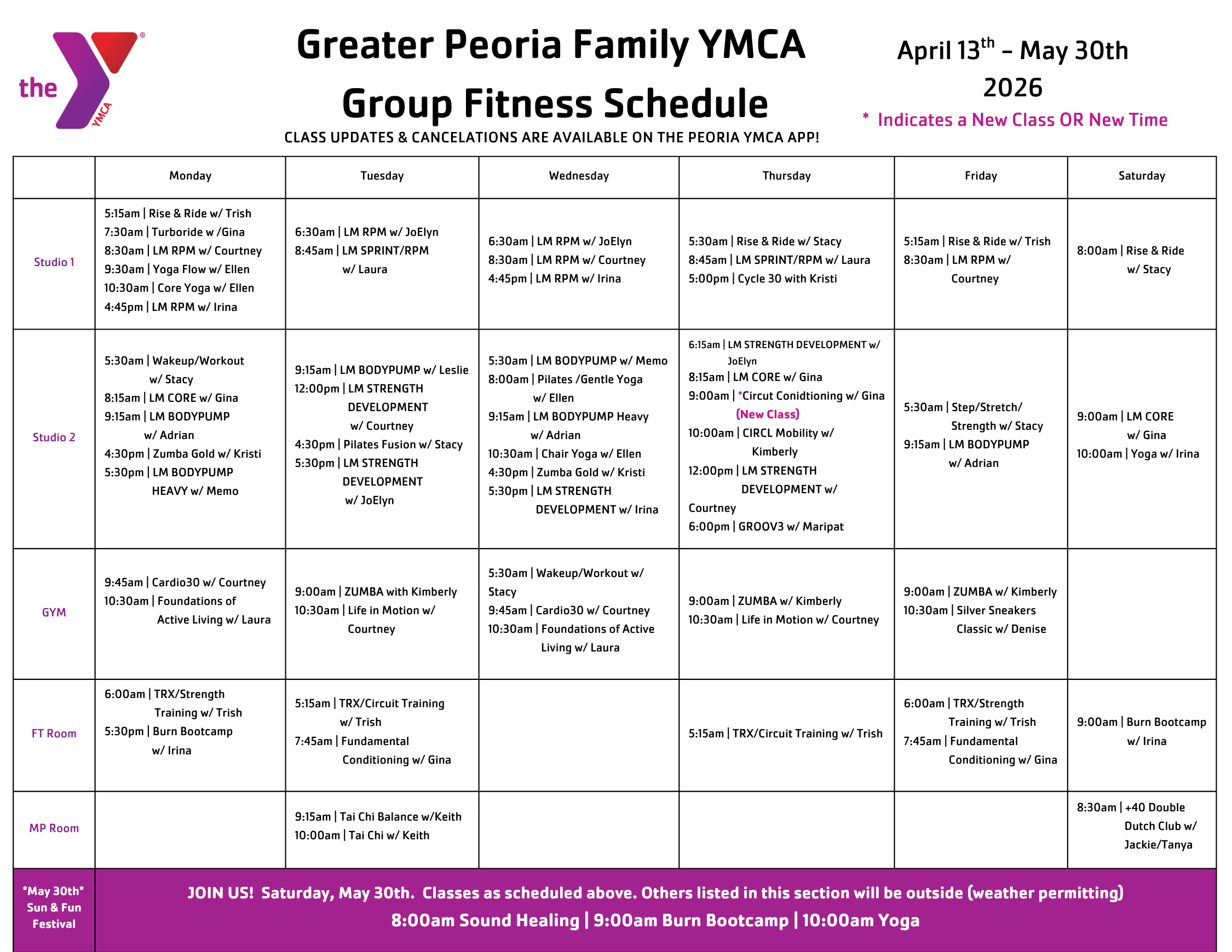 * Please note: All group fitness classes are subject to change. For up-to-date information, use the Peoria YMCA and Riverplex mobile app, available on Apple or Android devices.