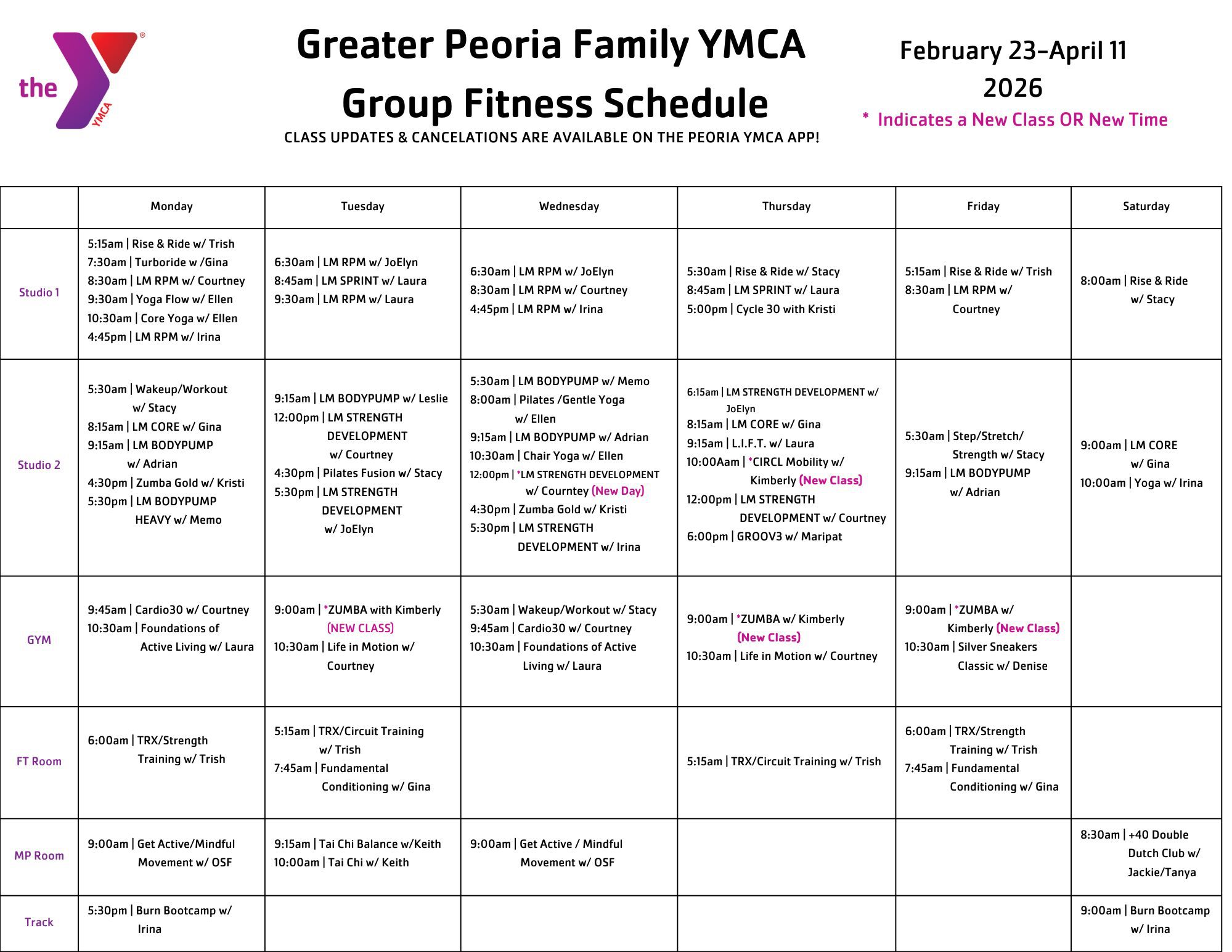 * Please note: All group fitness classes are subject to change. For up-to-date information, use the Peoria YMCA and Riverplex mobile app, available on Apple or Android devices.
